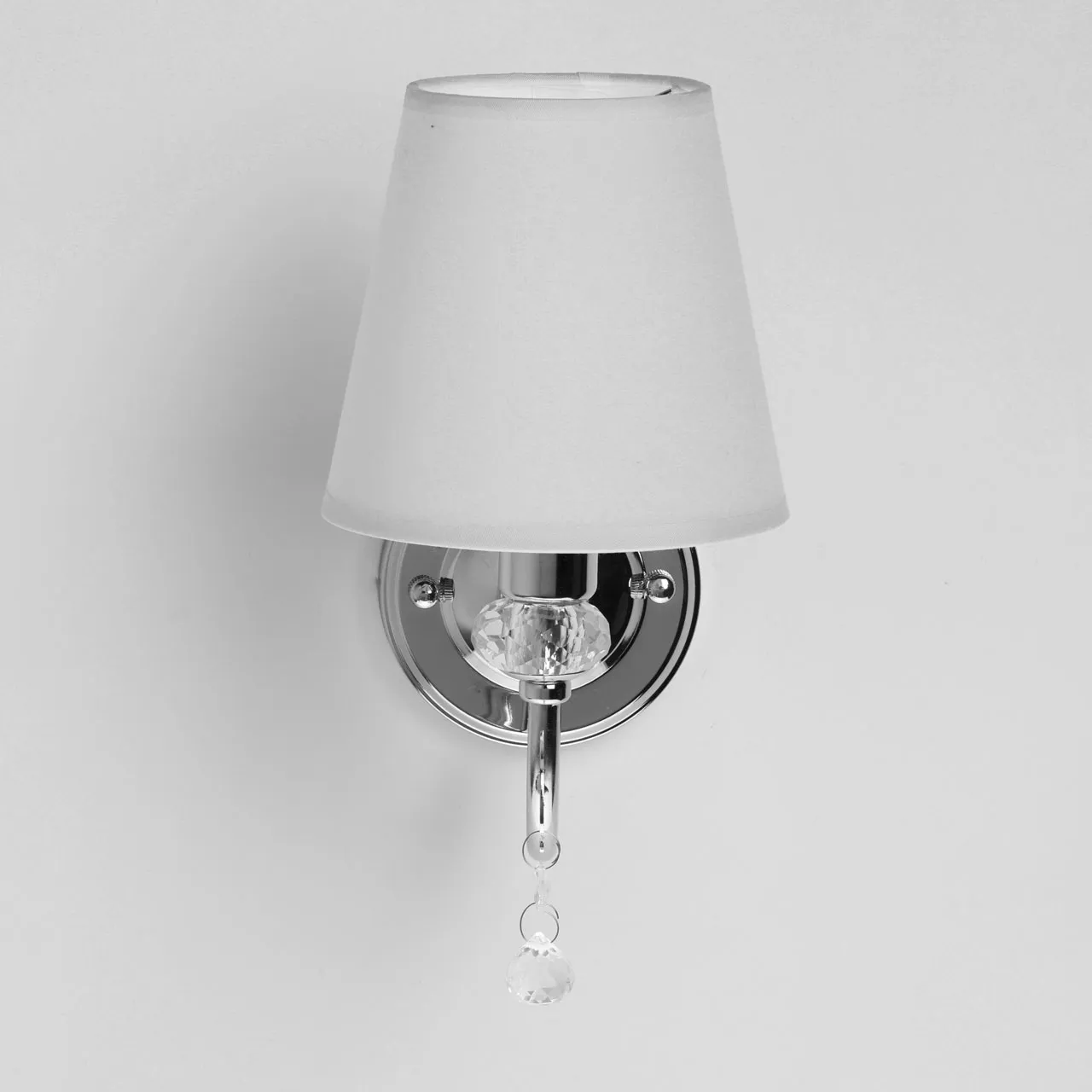 Основание/ металл/ хром Абажур/ текстиль, акрил/ белый, прозрачный Декор/ хрусталь/ прозрачный