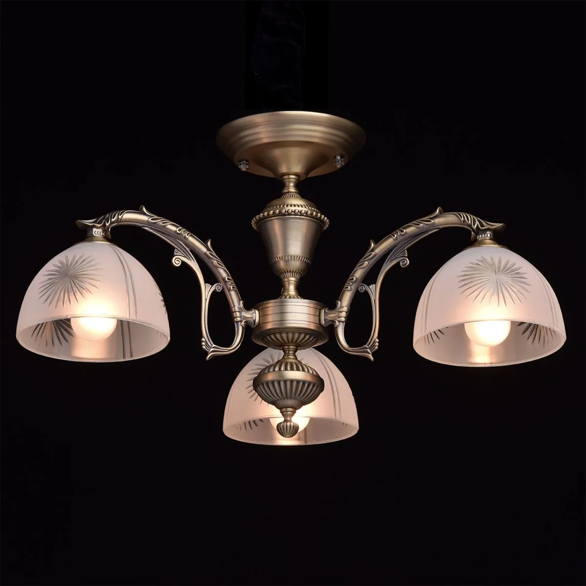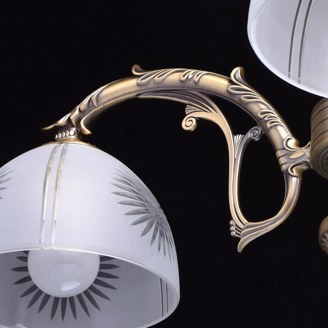 Металлическое основание цвета античной бронзы. Плафоны: стеклянный матовый плафон, обработанный алм